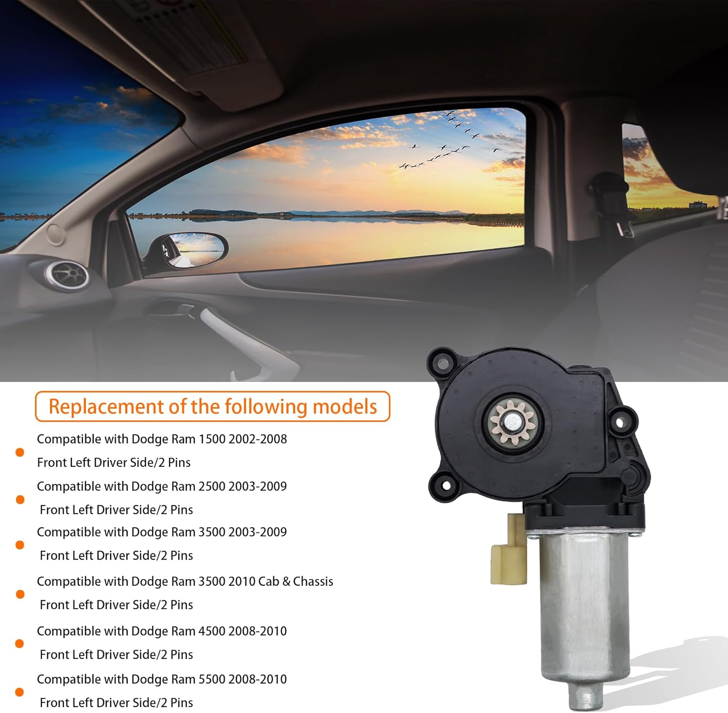 HXHAUTO has extensive experience in power window motor . Through careful design and remanufacturing by our team, we can improve performance and durability while using better materials and efficient technology, so that you can meet the demands of high quality and low cost while shopping happily.Do your Windows not go up or down properly?If your car window have can not lift, pause, weakness, abnormal sound and other problems, may be your Window regulator or window lift motor damage caused by failure, you need to replace in time,this will bring convenience to your life.Product informationAccessories type: Power Window Motor Installation position: Front Left Driver Side Anti-Clip Function Included: NO Terminal of connector:2 Pins Mounting Type: Self-Tapping Window Regulator Included: NO Quantity Sold: 1 Piece Reference Number:55275599AA 55275599AB 55275599AC 42-473 82-473 742-440Replacement of the following modelsCompatible with Dodge Ram 1500 2002-2008 ---Front Left Driver Side Compatible with Ram 2500 2003-2009---Front Left Driver SideCompatible with Ram 3500 2003-2009---Front Left Driver SideCompatible with Ram 3500 2010 Fit Cab&Chassis Only---Front Left Driver SideCompatible with Ram 4500 2008-2010---Front Left Driver SideCompatible with Ram 5500 2008-2010---Front Left Driver SideTips:Please pay attention to your model, year and installation position before purchase.