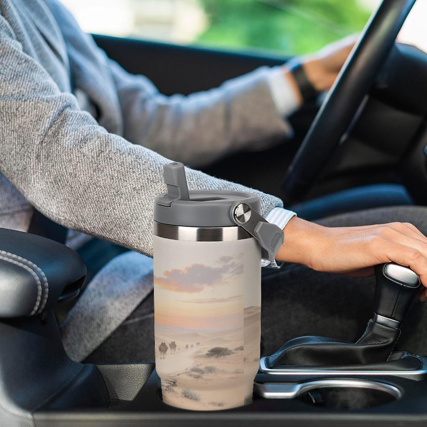 Whether you're on a long drive, a busy commute, or an outdoor adventure, staying hydrated is crucial. Our large-capacity car tumblers featuring the Camel Bells on The Ancient Road pattern were developed with this need in mind. They're the perfect solution for on-the-go hydration, ensuring a smooth and comfortable journey. With an impressive 30-ounce capacity, this insulated stainless steel travel tumbler easily meets your frequent hydration needs, from your morning commute to your after-get off work workout or even a full-day road trip. Without constantly searching for water, you can focus on the road ahead and say goodbye to thirst. Whether you're sweating it out on a scorching summer day or sweltering in your car on a dry winter night, staying hydrated helps you perform at your best. We understand your appreciation for quality and aesthetics, and our car tumblers feature unique designs that complement any vehicle's interior, exuding understated elegance. More than just a practical tool, they're the perfect finishing touch, adding a touch of style to your vehicle's interior.