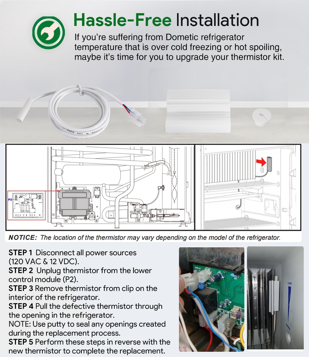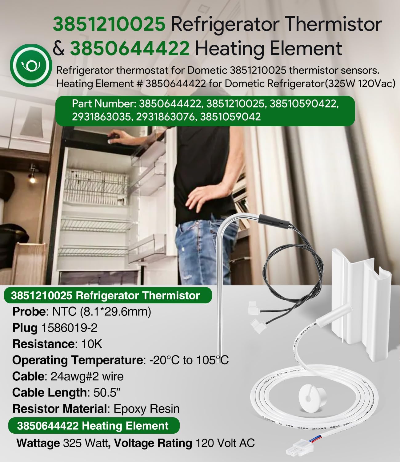 3850644422 120V/325W Heating Element & 3851210025 Replacement RV Refrigerator Thermistor for Dometic RM2652, DM2652, DM2852, DM2662, DM2663, DM2862
