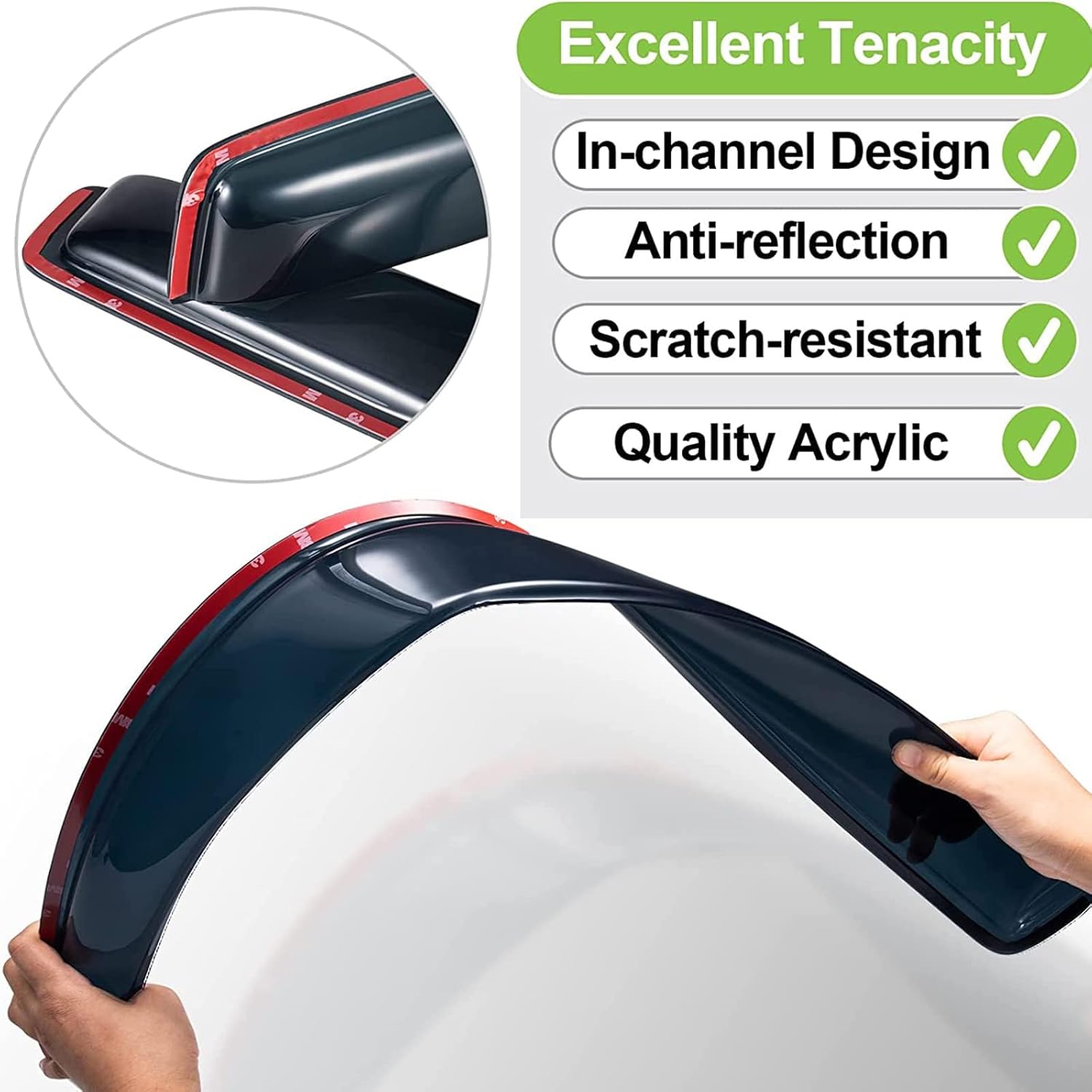 SPECIFICATIONProduct Name: Car Side Window Wind DeflectorMaterial: High Quality AcrylicInstall Location: Front Rear Side Door WindowPackage Included: 4pcs Vent Shade Window VisorsINSTALLATION DETAILSBe sure to clean the paste position thoroughly with detergent before installation.Hold the weather protection close to the window. Confirm the correct sticking position.Slowly align and paste the position to prevent it from skewing or even wrong sticking.After the installation is complete, compact the bonded parts. Do not wash the car for three days.Easy installing, The automotive adhesive tape is attached, pre-installation heating the tape is recommended.Please confirm the model and year before purchasing. If any question please email to us, we will try our best slove the problem for you. Thanks for your understanding!