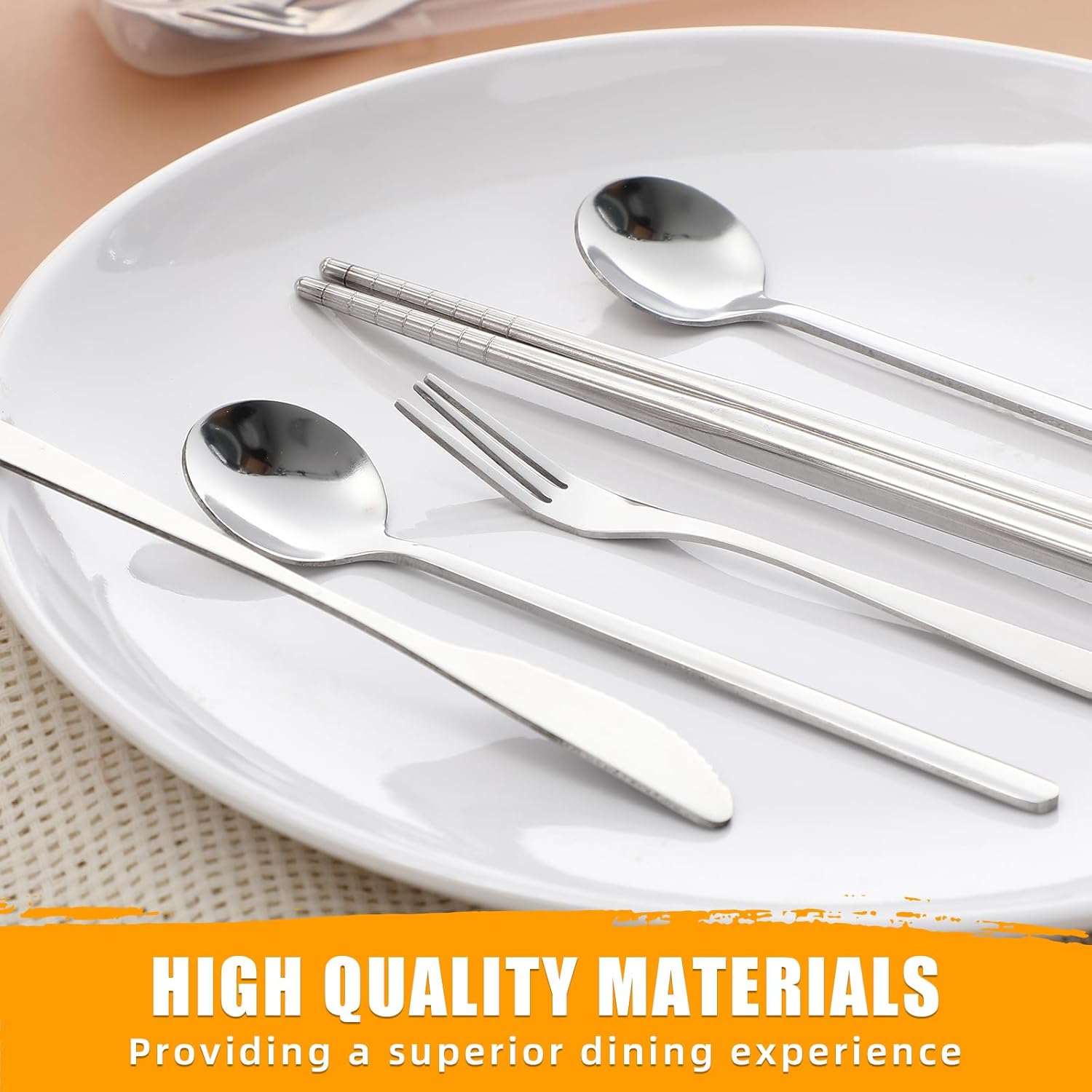 Features: This product is expertly designed to prevent leaks of thick sauces like ketchup, salad dressing, and similar condiments. Please note that it is not fully leakproof for pure liquids such as water. Small in size and light in weight, making lunch silverware with case easy to carry around. Best choice for 1 person's daily use, and also suitable for travels, picnics, barbecues, street foods, school office lunches, camping, hiking, home travel, parties or and eating outdoor, etc. Specifications: Material: stainless steel Color: sliver Size: Bento boxes: 9.5 x 6.7 inch/24 x 17cm Chopsticks: 7.09 inch/18cm Forks: 5.20 inch/13.2cm Spoon: 5.20 inch/13.2cm Knives: 5.31 inch/13.5cm Clear cutlery case: 8.27x1.97inch/21x5cm Package includes: 8 x Bento boxes 8 x Chopsticks 8 x Forks 8 x Spoon 8 x Knives 8 x Clear cutlery case Notes: Manual measurement, please allow slight errors on size. The color may exist a slight difference due to different screen displays