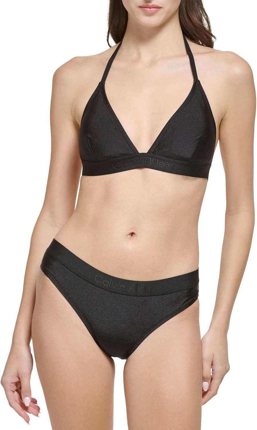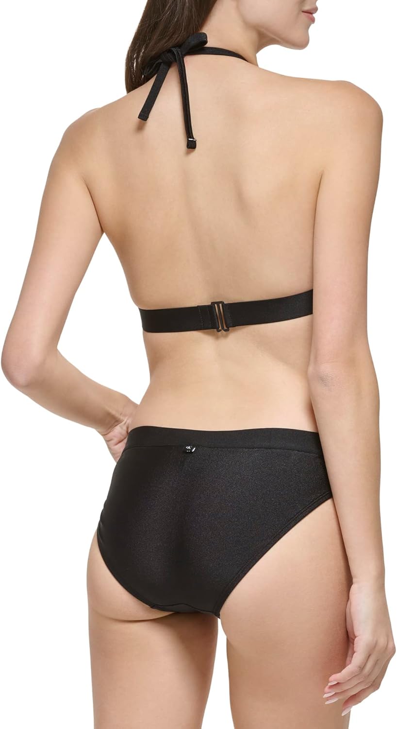 This Calvin Klein Women's Lifestyle 2 Piece Set is a Halter tie bikini top removable soft cups logo elastic bikini bottom shimmer fabric
