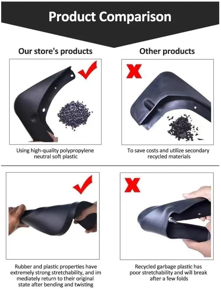 These mudguards are suitable for various scenarios, including daily city driving, rugged suburban roads, and outdoor environments. They combine protection and style, safeguarding your vehicle in all road conditions while ensuring a comfortable driving experience.Simple and stylish, beautiful appearancePrevents mud splashing and keeps the appearance clean and tidy.Made of high quality material to ensure safety and durability.Item:Car Splash FendersApplicable Year:2016 2017 2018 2019Color:BlackInstall Location: Front wheels and Rear wheelsPacking List:Set of 4 Fenders