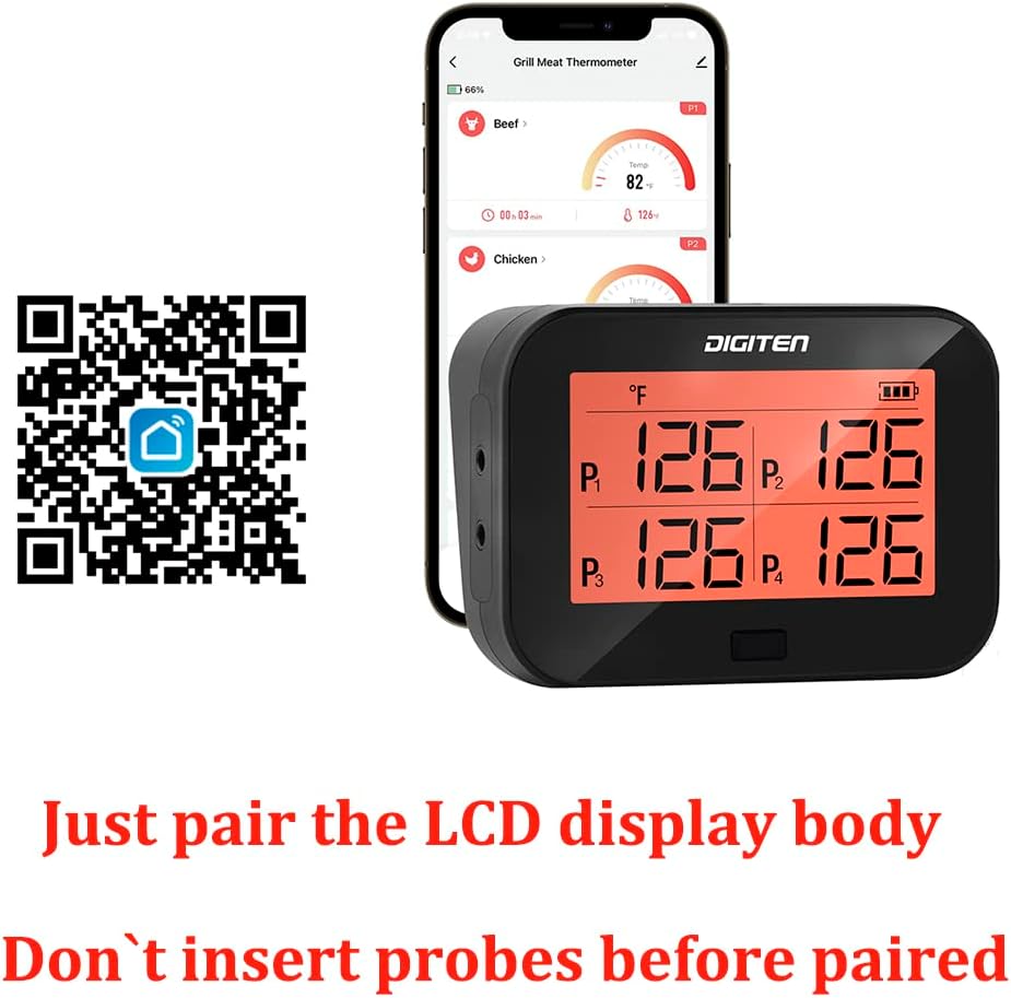 | Included Components | Meat thermometer displayer, 4 temperature probes, 2 stainless holders, 4 probe winders, 1 user manual, 1 USB charge cable |