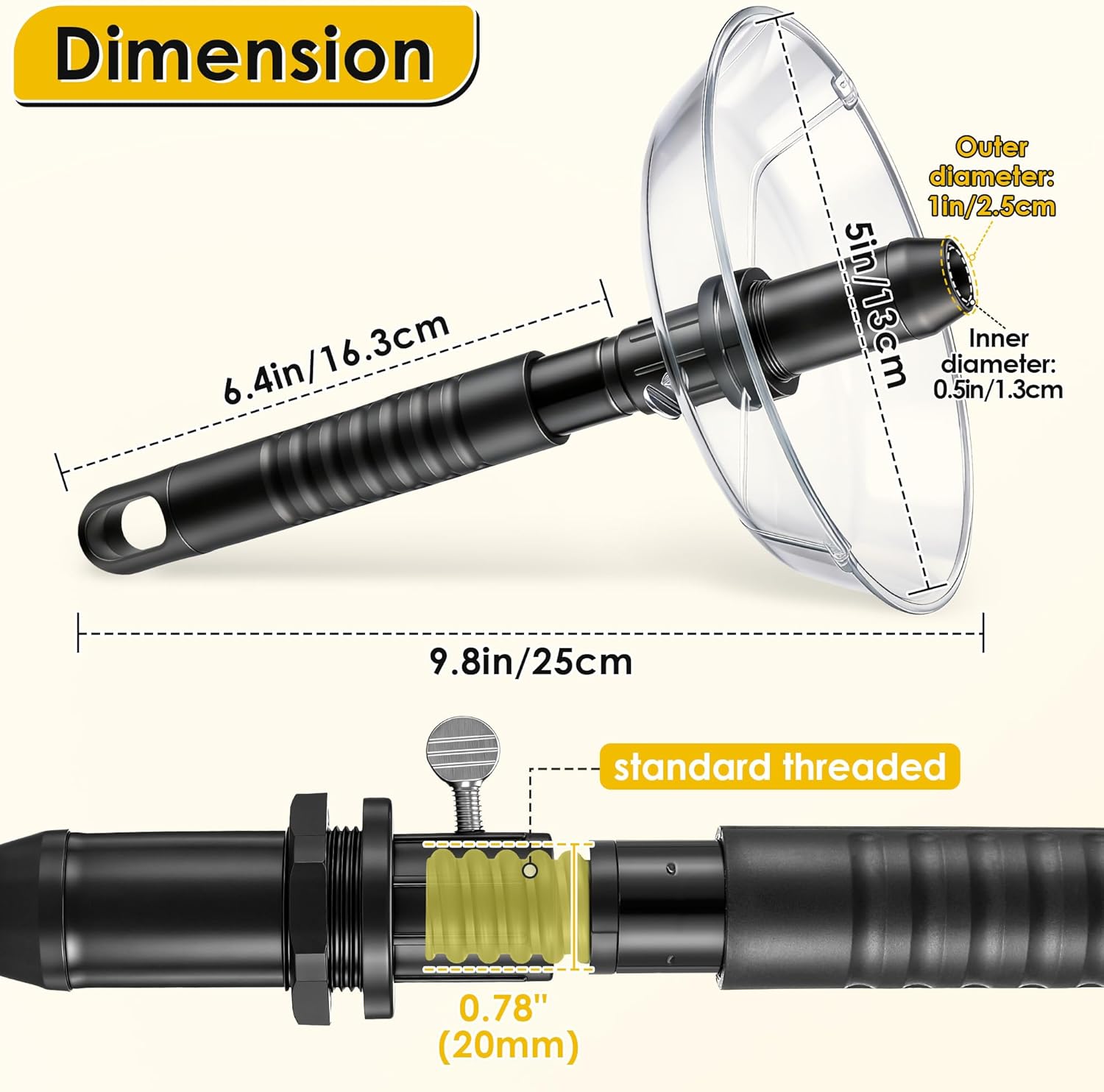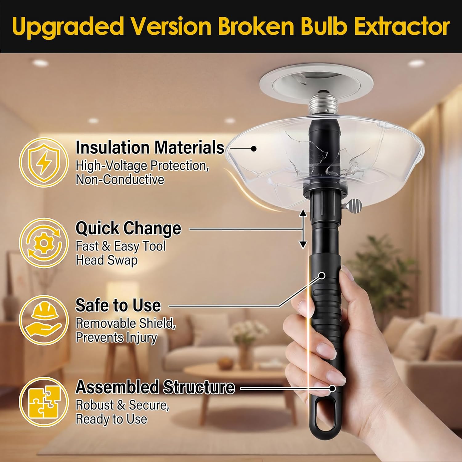 Use the broken bulb extractor to quickly remove base of standard incandescent bulbs! Specifications: Material: Plastic Color: Black Size: 25 x 13cm . 9.8 x 5in Bulb base: E26 and E27 light bulb base light type: Incandescent Feature: The bulb changer can be extended by connecting to any standard brick thread pole, making it easy to remove broken bulbs on high ceilings. The included plastic removal tray protects you from lamp glass fragments. The broken bulb extractor is easy to use, you only need to twist it when using it to easily remove the broken bulb base. Compatibility: Only works with standard incandescent broken light bulbs, this broken bulb changer is compatible with E26 and E27 light bulb base. Does not work on small candelabra bulb bases (E12). Not suitable for most LED bulb removals. Not suitable for appliance bulbs of irregular sizes. Compatible with DocaPole and other standard threaded extension pole such as standard threaded paint pole or broom pole. Package includes: 1 x Broken Light bulb changer with standard thread 1 x Plastic detachable tray 1 x Black non-slip handle 1 x Locking screw Note: Turn off all electricity to the light socket before replacing your light bulb.