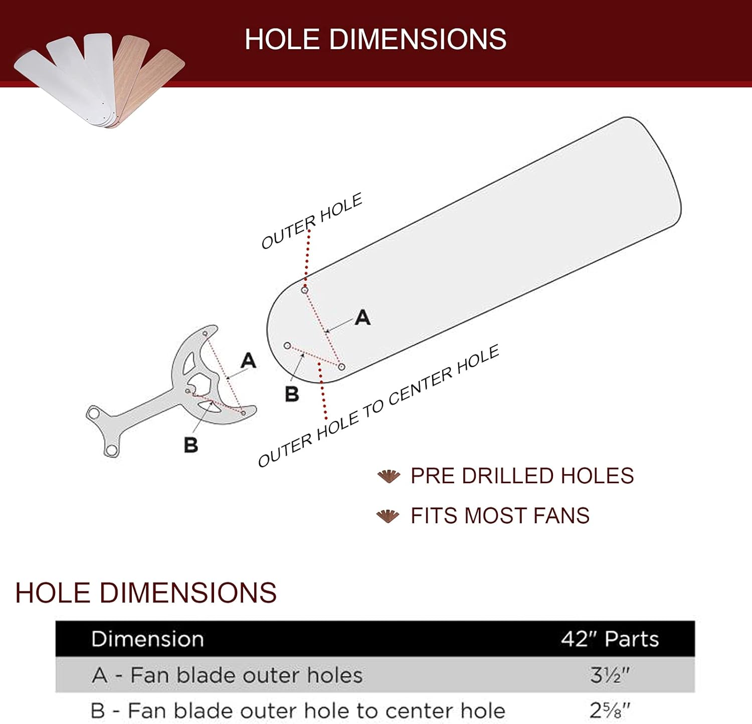 Dysmio 42-Inch White/Bleached Oak Finish (MDF) Replacement Ceiling Fan Blades are Lightweight Fan blades designed to make your rooms more ventilated and cool. Coming in Two different Finishes, White and Bleached Oak, the fan blades complement any décor and blend in with any ceiling color. An uneven set of fan blades causes the fan to wobble and decreases the life of the Motor. The Dysmio Fan blades are designed to restore balance and increase the performance of your Ceiling Fan. Best results are achieved when the same fan blades are used. The product is perfect for fans with 5 blades or less. Pre-drilled holes on the fan blade make the assembly an easier process. Easy-to-follow drilling instructions are included with the set if pre-drilled holes don't align, making the installation process hazzle free. Product Dimensions★Width: 5- inch★Length: 16-1/2-inchHOLE DIMENSIONS★A - fan blade outer holes 3-1/2-inch width★B - fan blade outer hole to center hole 2-5/8-inch width