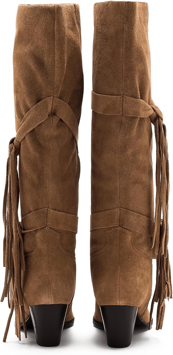 Add texture and flair to your shoe collection with these boots, featuring slouchy suede uppers, a pointed toe, and tied fringe detailing for a Western-inspired touch. * Suede uppers * Pull-on style * Pointed toe * Stacked heel * Rubber outsole