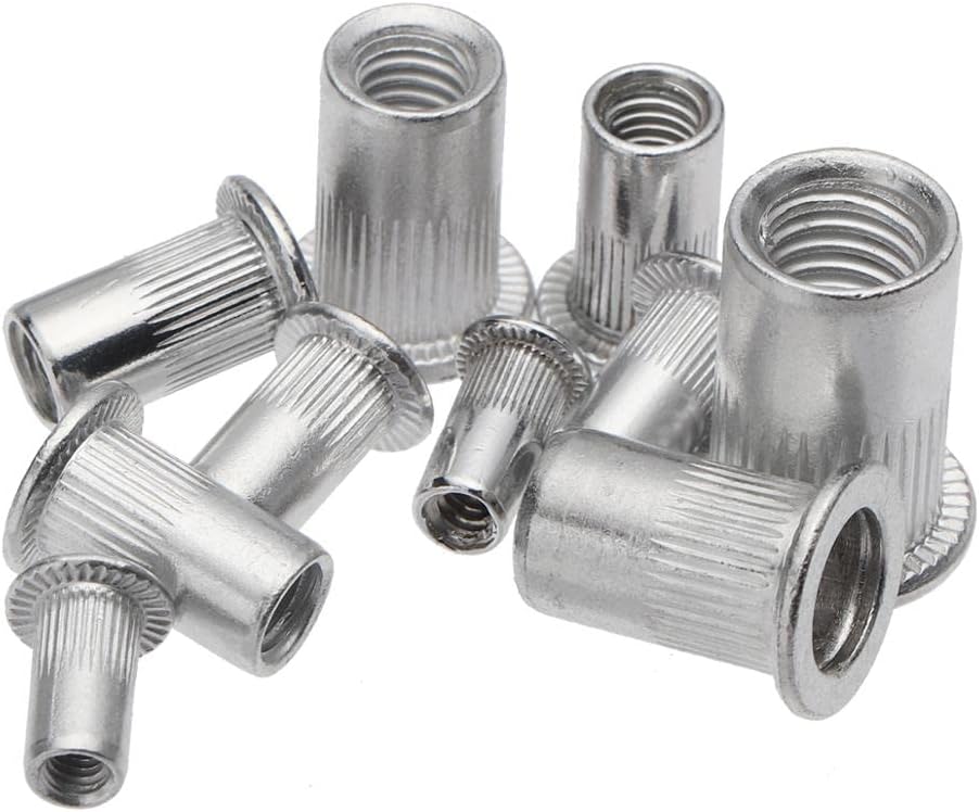 Package Included300pcs Metric Rivet Nut Insert Rivnut Nutsert AssortSpecifications:Name : Aluminum Rivet Nut Category:Rivet Nut Material : Carbon Steel, Zinc Plated Quantity:300pcs Package Weight:300g Sizes as follow: 50pcs x 6-32 Rivet Nuts 30pcs x 8-32 Rivet Nuts 25pcs x 10-24 Rivet Nuts 25pcs x 10-32 Rivet Nuts 20pcs x 1/4-20 Rivet Nuts 50pcs x M3 Rivet Nuts 40pcs x M4 Rivet Nuts 30pcs x M5 Rivet Nuts 20pcs x M6 Rivet Nuts 10pcs x M8 Rivet NutsFeatures1. Strict production standards, industrial quality, high-quality galvanized carbon steel rivet nut kit, durable. 2.Strong and corrosion-resistant, not easy to rust. Easy to use and practical.Large flange, ribbed to better prevent rotation (6-32 may be ribbed or plain). 3. Reusable, easy to store and organize box packaging, easy to access and not easy to lose accessories. 4. A variety of applicable materials, rivet nuts can be installed in a variety of different materials including steel, plastic and fiberglass. 5. A wide range of applications, suitable for automobiles, furniture, decorations and other electrical appliances and industrial products.Note1.Please allow 1-3mm errors due to manual measurement. 2.Due to light and screen setting difference, item's color may be slightly different from the pictures. Please understand.