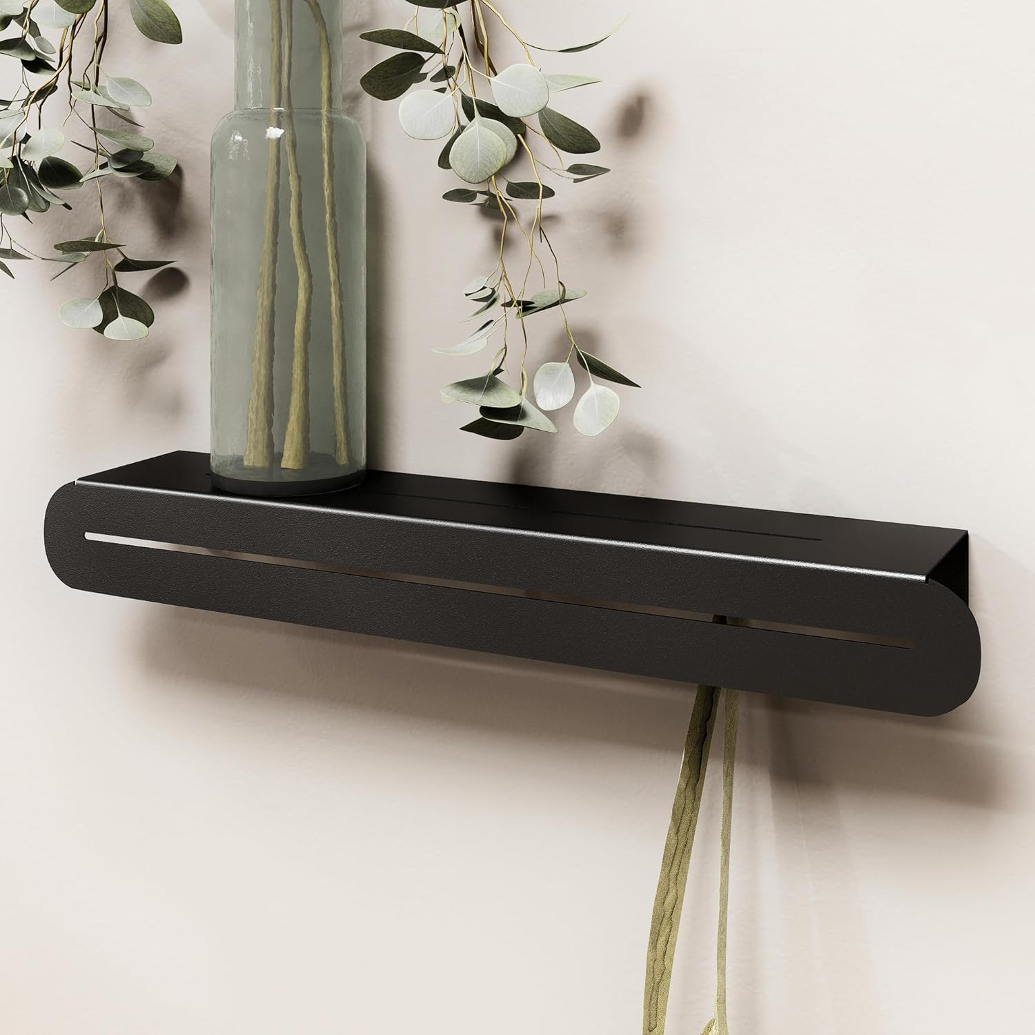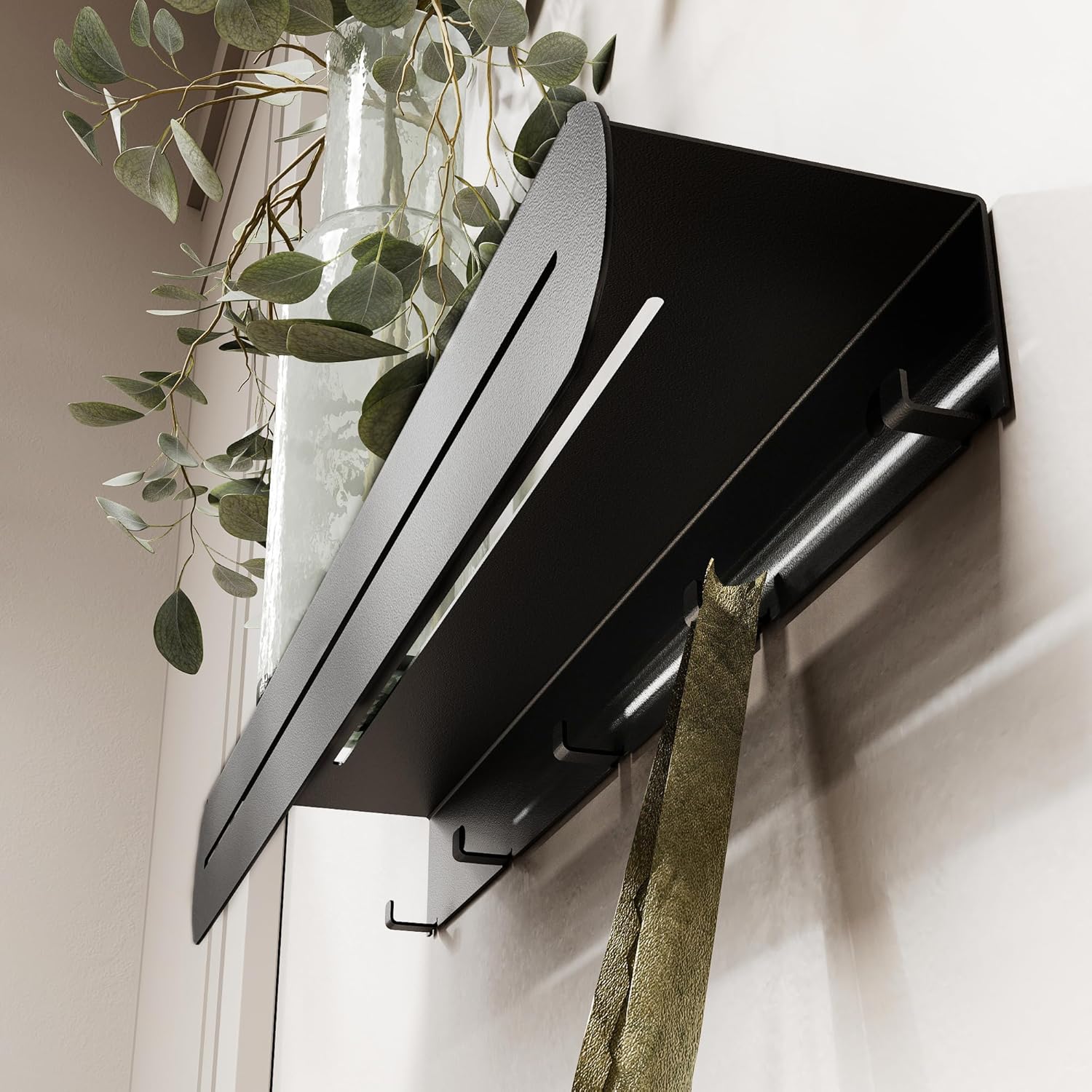 Our modern wall mounted coat rack with shelf combines minimalist design with maximum functionality - perfect for any home that appreciates style and order. Crafted from high quality metal and featuring a durable powder-coated finish in elegant black, this coat rack offers a durable yet stylish solution for everyday organization. The fine structure of the coating not only provides an elegant look, but also protects the surface from scratches, moisture and wear. The coat rack with 5 concealed coat hooks offers enough space for jackets, coats, bags, towels or kitchen utensils. Thanks to the concealed design, the hooks look particularly modern and unobtrusive. The sturdy storage surface above it is ideal for decorative items, keys, bathroom accessories or other everyday items that should be kept at hand. Whether in the hallway, in the bedroom wall, the kitchen or even in the bathroom as a shower shelf, this coat rack panel blends harmoniously into any environment. The minimalist style makes it a versatile furnishing element that fits perfectly into modern, Scandinavian or industrial living concepts. The wall mounting is uncomplicated and safe, so that the coat rack can easily carry heavy clothes. The combination of high stability, functional storage and stylish design makes this product an excellent choice for anyone who wants to combine order with aesthetics. Bring new comfort to your everyday life with a wardrobe that not only looks good, but also works reliably. This modern design coat rack is the ideal solution for any home that values quality, functionality and modern design.