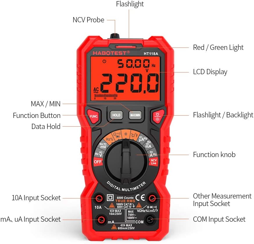 HT118A Digital Multimeter Auto Multi-Meter 6000 Counts True RMS Measuring AC/DC Vole Current Resistance acitance Frequency Temperature NCV Test Diode with LCD Back Flash