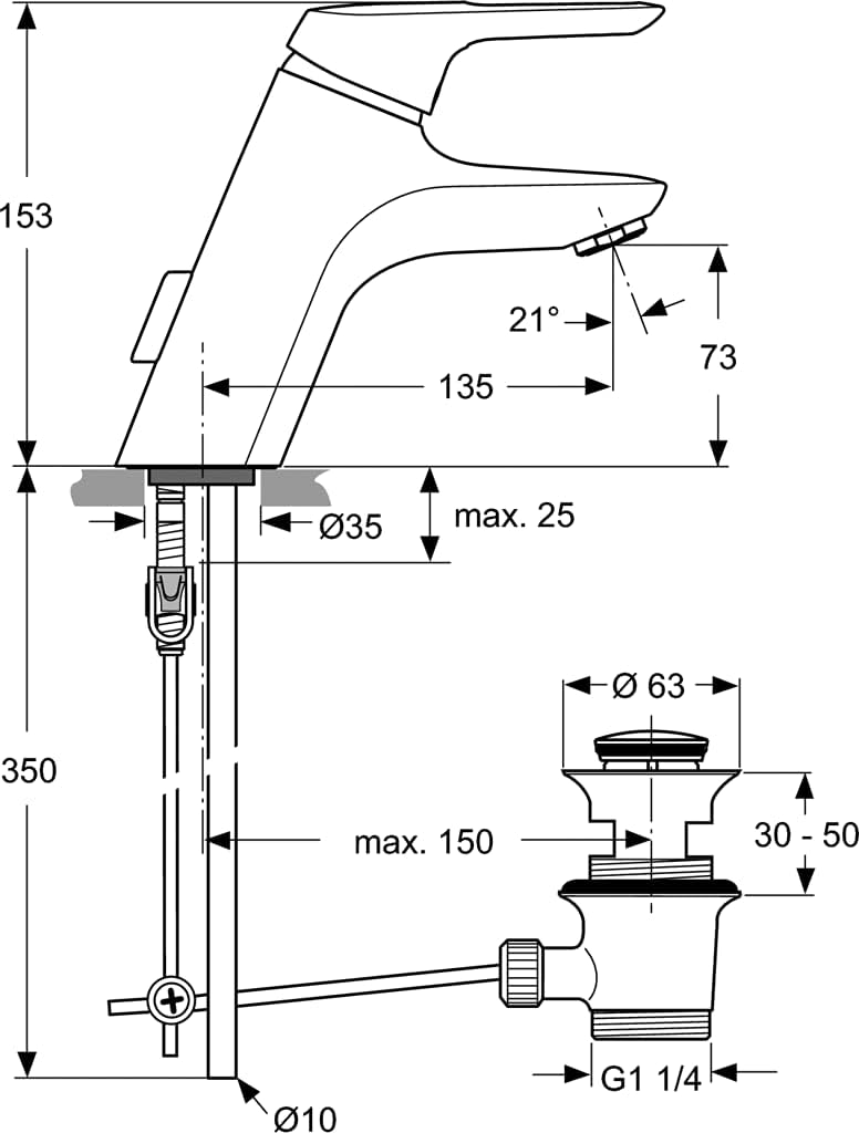 Einhebel-Waschtischarmatur DN 15. Mit Kupferrohren. IdealPure nickel und bleifreie Wasserwege. Cool Body und verminderter Wasser- und Energieverbrauch dank isolierter Wasserwege. Totraumreduziert. Starrer Gussauslauf und Luftsprudler. Zugknopf Ablaufgarnitur G1 1/4. Ausladung 135 mmit Auslaufhöhe 73 mmit Bedienungshebel aus Metall. Befestigung von oben (TOP-FIX-Schnellmontagesystem). Durchmesser 40 mm CLICK-Kartusche mit keramischen Dichtscheiben. Kartuschenübersetzung aus Edelstahl. Integrierte Heißwassertemperaturkontrolle und ECO-Funktion. Integriertes Fettreservoir (lebensmittelverträglich). Lebensdauertest EN 817. Geräuschverhalten DIN 4109, Gruppe 1. WELL***-Zertifiziert (3-Sterne). Oberfläche: Chrom Gesamte Höhe: 153 mm Kartuschenschwenkbereich: 90 Grad Durchfluss (3 bar): 11 l Hersteller: Ideal Standard Serie: CeraMix Blue Artikel-Nr.: A5653AAAblaufgarnitur G1 1/4. Ausladung 135 mmit Auslaufhöhe 73 mmit Bedienungshebel aus Metall. Befestigung von oben (TOP-FIX-Schnellmo