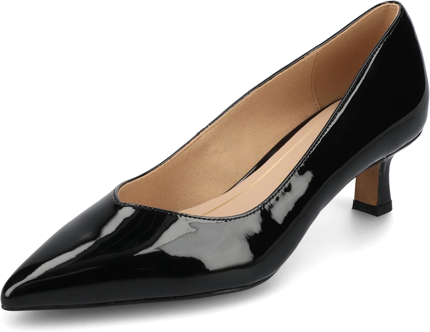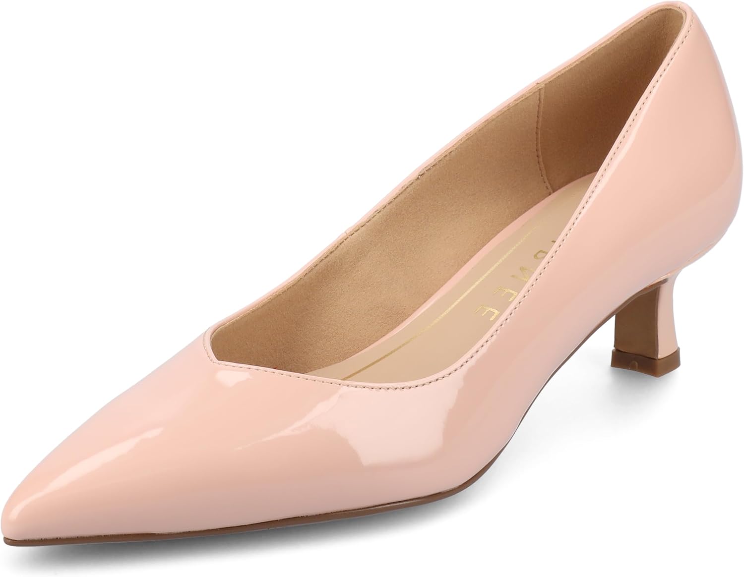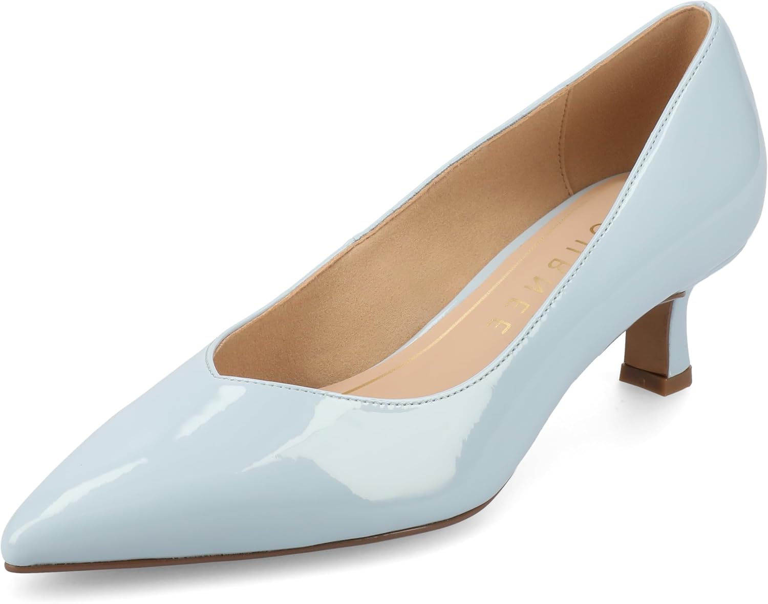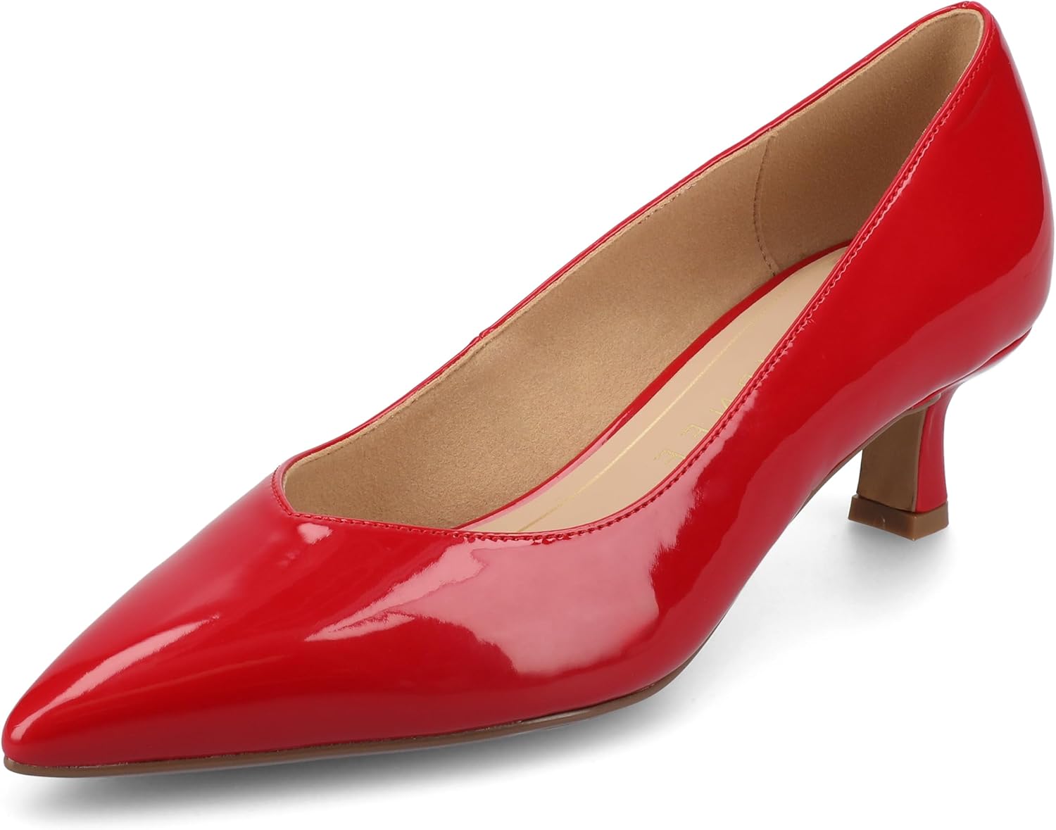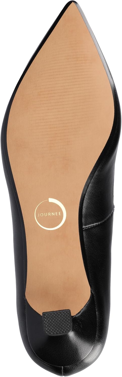 The Pammie kitten heel from Journee is crafted from sleek faux patent leather and features a slip-on design for easy wear. Its pointed-toe and sweetheart detail add a feminine touch to the silhouette. With a comfortable kitten heel and cushioned insole, this women's shoe combines style and grace, perfect for a polished look. Also available in wide width.