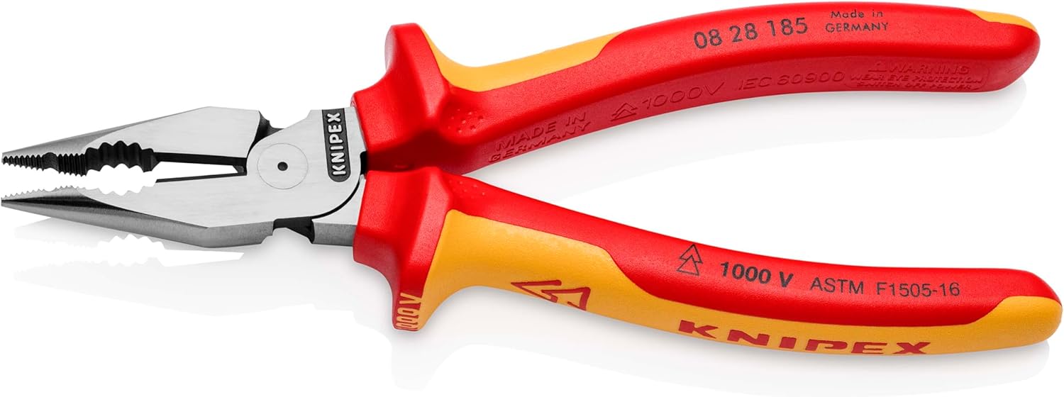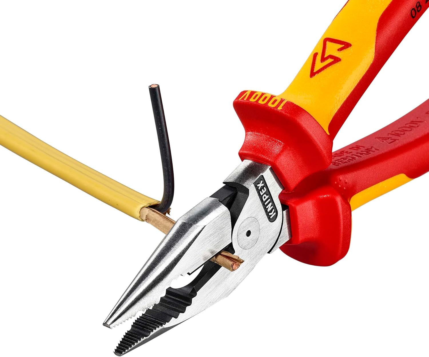 The very popular needle nose combination pliers now available in 7 1/4" length.. For use when working in confined areas thanks to slim head design and pointed jaws (anti-twist). Gripping surfaces with special convex contour provides a stable 3-point contact for secure gripping of flat parts contact for secure gripping of flat parts. The asymmetry of the pipe gripping area allows round parts as well as hexagonal profiles to be gripped, held and turned powerfully without slipping. Milled groove in the gripping area permits small parts such as nails, pins and bolts to be held and pulled. Cutting edges induction-hardened (approx. 64 HRC) for easy cutting of soft, medium-hard and hard wire. 1000V multi-component grips, ASTM F1505-tested. High-grade special tool steel; forged, multi stage oil-hardened.
