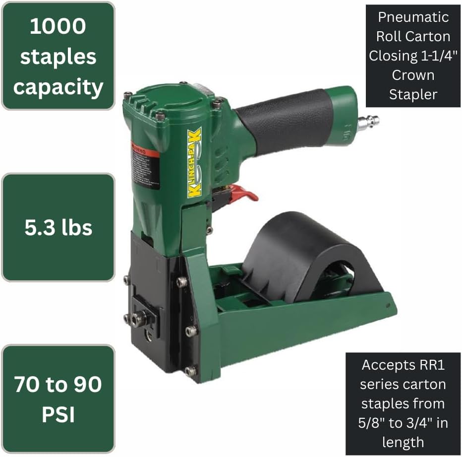 The Klinch-Pak KP-RR1 pneumatic roll stapler drives 1-1/4" crown RR1 series carton staples from 5/8" to 3/4" in length. Includes one-year manufacturer's warranty. A lightweight and well-balanced design makes this Klinch-Pak stapler suitable for high production volume. Additional features include a 1,000 staple magazine, soft rubber grip, adjustment for depth of clinch, and adjustment for tightness of clinch. The KP-RR1 industrial grade roll stapler is excellent for folding boxes, complete overlap and more.