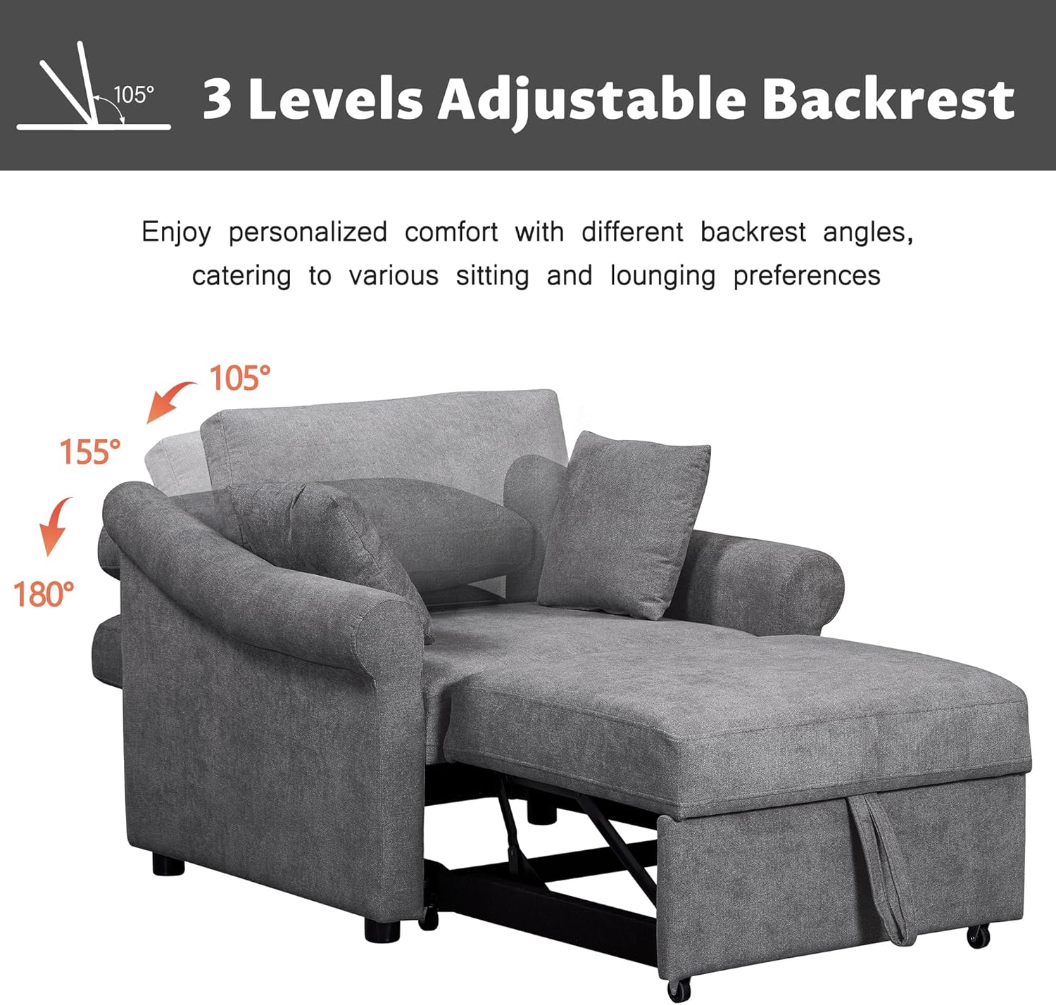 LUMISOL focuses on providing you with high-quality furniture and is committed to bringing happiness to every buyer's life. This single sofa bed is a functional and attractive piece of furniture designed for limited spaces. Overall Dimensions: 40.2"L x 37.4"W x 33.5"H Seat Dimensions: 29.1"L x 20.9" x 17.7"H Length of Full Expansion: 69.3" Weight Capacity: 400LBS Overall Product Weight: 101LBS Upholstery Material: Chenille Material: Solid Wood + Metal Level of Assembly: Full Assembly Needed Suggested Number of People:1 Warranty Time: Six Months(Manufacture Defect) Additional Tools Required: All Tools Included Number of Package:2 Country of Origin: Vietnam LUMISOL Notice: All colors on our website are for reference only, actual product colors may vary a little bit, due to different color settings of every screen device. Please note: most of our sofas are hand-measured, therefore the dimensions are for reference only, and may marginally deviate.