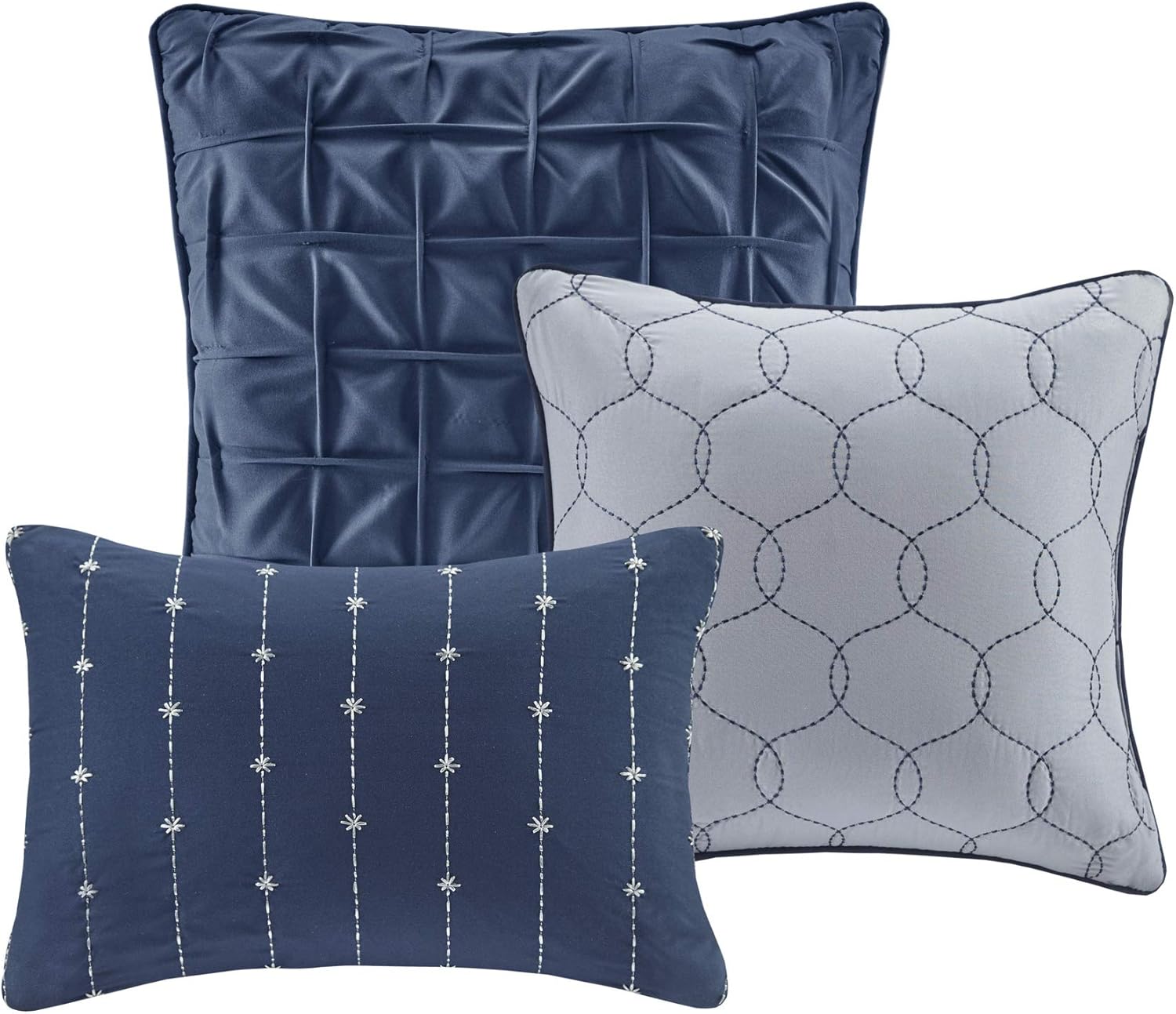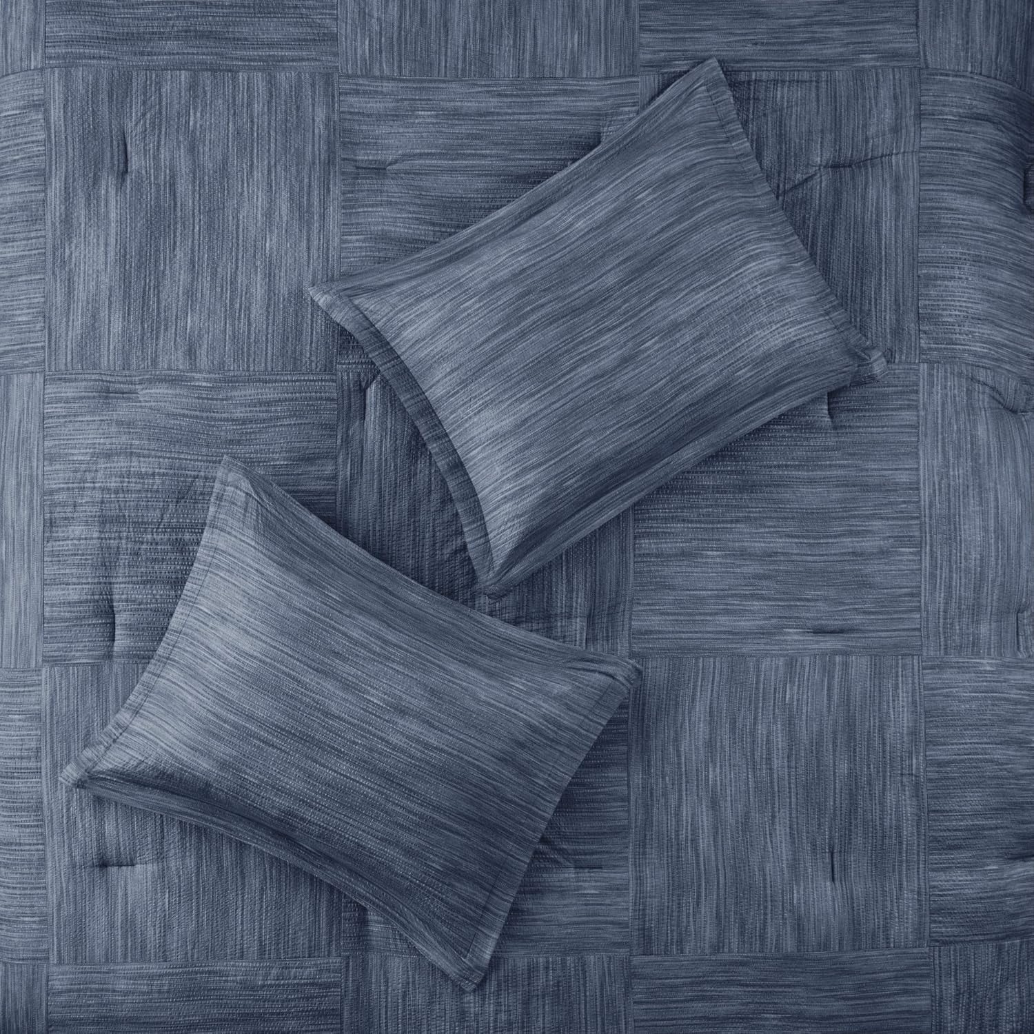 The Madison Park Walter 7 Piece Printed Seersucker Comforter Set offers a chic modern update to your bedroom. This navy comforter set features a pieced, textured printed seersucker weave design for a updated transitional allure. Two matching shams repeat the style of the comforter, while two square pillows and one oblong decorative pillow add dimension and comfort to the bed. A solid navy bedskirt adds the finishing touch to complete the contemporary comforter set. Hypoallergenic polyester filling in the comforter and the pillows provides exceptional warmth and comfort. Transform your bedroom decor with the trendy style of this printed seersucker comforter set. Machine washable for easy care.