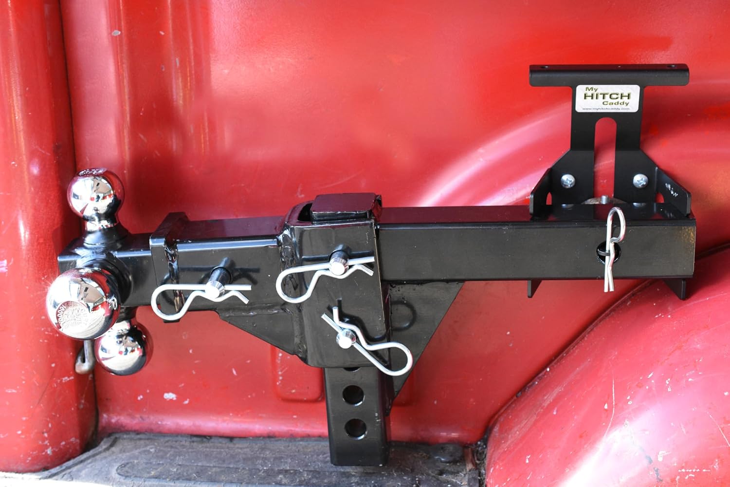 My Hitch Caddy is a patented bracket designed to safely secure your 2" trailer hitch and pins conveniently out of the way when you are not using them. It's versatile design allows you to mount the bracket anywhere you want in a variety of ways that is most convenient for you. You can mount it in your truck, suv, trailer, garage, shed, and more! Holds more than 50 pounds! Never have lost or stolen hitches and pins ever again or worse, bang your shins! Always have your hitch when you need it and have peace of mind knowing it is safely stored and not rolling around making noise or a mess!