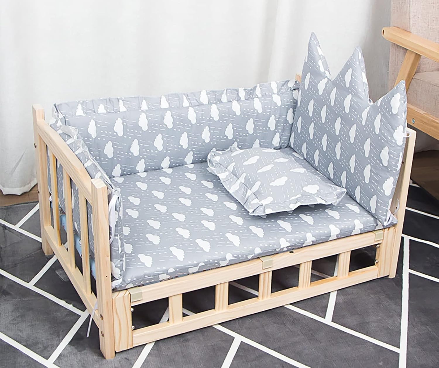 Own this chic pet bed sofa, your pet is a cute princess and prince. Sleeping with an elevated dog bed is more comfortable, cleaner, dryer, and healthier compared to the ground, it is ideal for either dogs and cats, and is the best gifts for your pets.Specification: - Material: Wood Frame + Wood Fiber Bed Board- Type: Elevated Pet BedFeatures: - Keeps your pet away from the cold, tough floor, mud and wet grass. - Solid wood frame, polished smooth, easy to assemble and disassemble. - The slatted base gives your pet sturdy and stable support, without sagging or loss of shape.- Ideal for all breeds and ages of dogs, cats and pets.- Allowing your pet to enjoy a deeper, more restorative sleep.- A perfect gift for your dogs, cats and pets.Package Content: - 1 x Pet Bed - 1 x Pet Mattress- 1 x Pet Pillow (Not including other ornaments).Suggest: - Place a chew toy for your pet, in hopes your dog will chew the toy and not the pet bed!- Please avoid any scratches, we would propose cutting your dog's nails frequently.Warm Prompt:- Pet beds are designed for pet use only.- Due to light and personal differences in color understanding, there will be small color difference, in kind, prevail.- Due to different measurement methods, the error is generally 1-2 cm, and the error range is not within the quality range.Service Guarantee:- We provide high-quality 24- customer service. For any questions about the pet bed, please contact us as soon as possible, and we will answer and solve your questions.