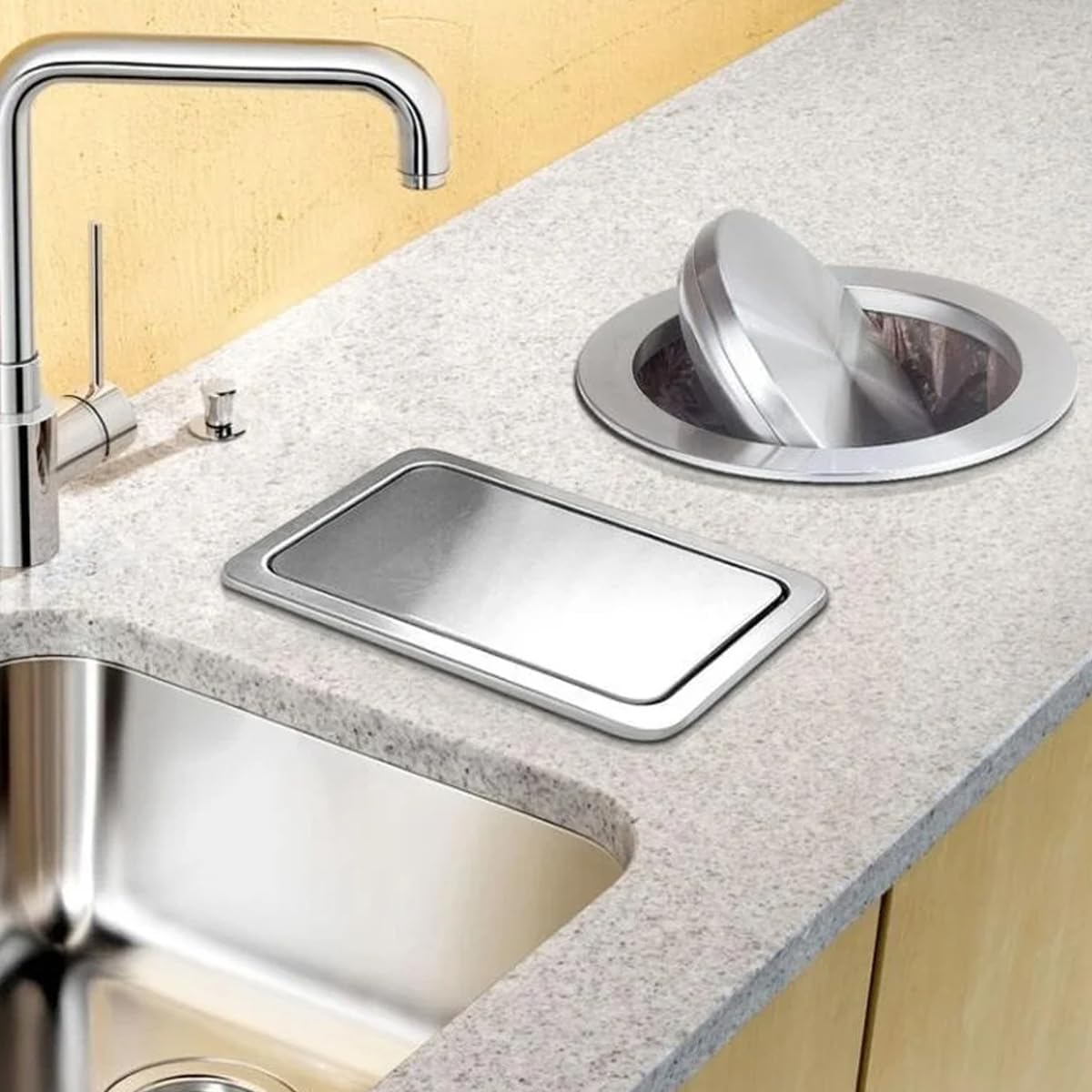• FLEXIBLE TRASH BIN BUILT-IN FLAP LID: This is a flexible stainless steel built-in trash can balanced lid with a center swing that allows the lid to be easily opened from both sides.