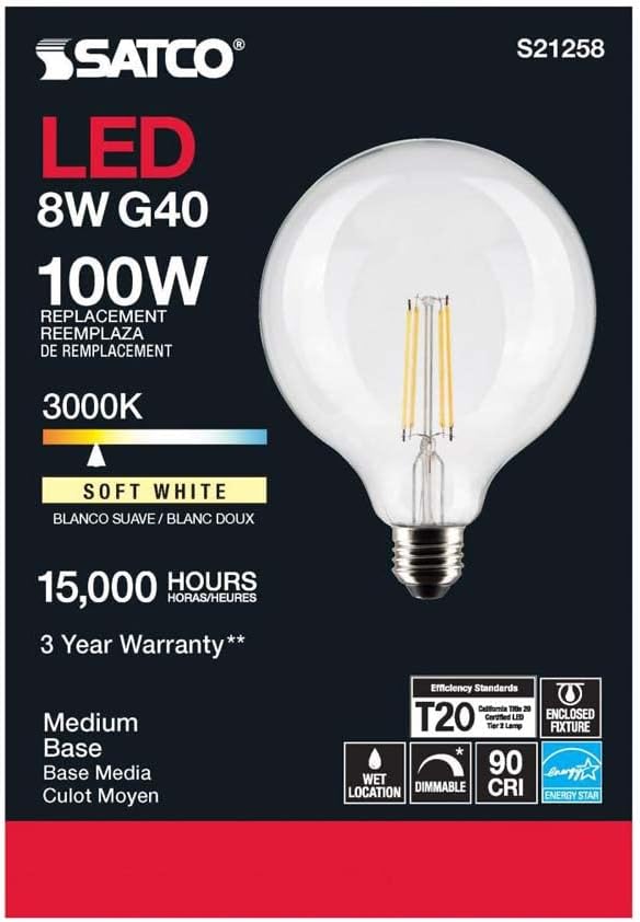 Satco's S21258 8-watt LED lamp is traditional, yet contemporary with its vintage style and energy saving LED technology. Elegantly illuminate any room in the house with this dimmable, globe shaped bulb. Sophisticated and modern, this lamp delivers 15,000 hours of warm white light.