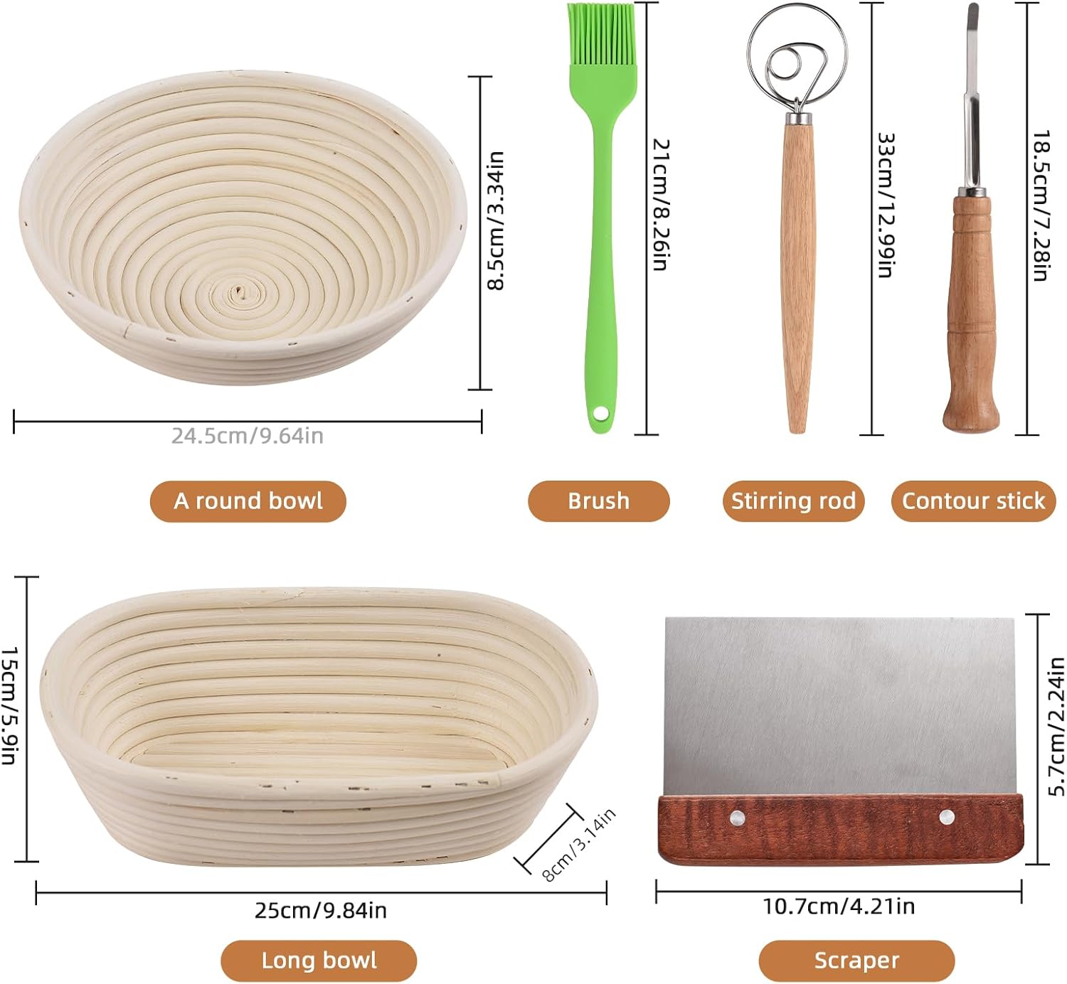 This complete bread making kit include 10 inch round and oval proofing baskets, bread lame and 5 blades, bread whisk, cutter, 2 bowl cover and brush. Bread bowl made of natural rattan cane, smooth and wick . Perfect for home, starter, professional and bakery. 【Natural Material】Our bread proofing baskets are made of natural rattan cane, which are smooth, no splinter, non-stick. Especially wick away from the dough surface and make better bread. 【Easy To Clean】Handmade bread baskets are sturdy and durable, smooth surface, comfortable to touch, easy to wash and quick dry. Use the linen liner for even easier cleaning. 【Easy To Use】The bread baking supplies makes the dough easily stay in shape, and you can easily carve patterns and cut bread. Quickly and effectively making bread and enjoy the delicious with your family and friends. 【Perfect Gift for the Bread Baker】Sourdough bread baking supplies include complete bread making accessories, suitable for home, starter, professional and bakery. You and your family, friends can DIY various bread with our sourdough starter kit. Note: The blades are very sharp, be careful when use. Specifications: Material: Rattan + Cloth + Silicone + Stainless Steel Round Bowl Size: 24.5 * 24.5 * 8.5cm / 9.6 * 9.6 * 3.3in Oval Bowl Size: 25 * 15 * 8cm / 9.8 * 5.9 * 3.1in Package Size: 25 * 25 * 8cm / 9.8 * 9.8 * 3.1in Package Weight: 920g / 32.5oz Packing List: 1 * Round basket 1 * Oval basket 1 * Bread lame 5 * Blades 1 * Bread whisk 1 * Bread cutter 2 * Bowl cover 1 * Brush