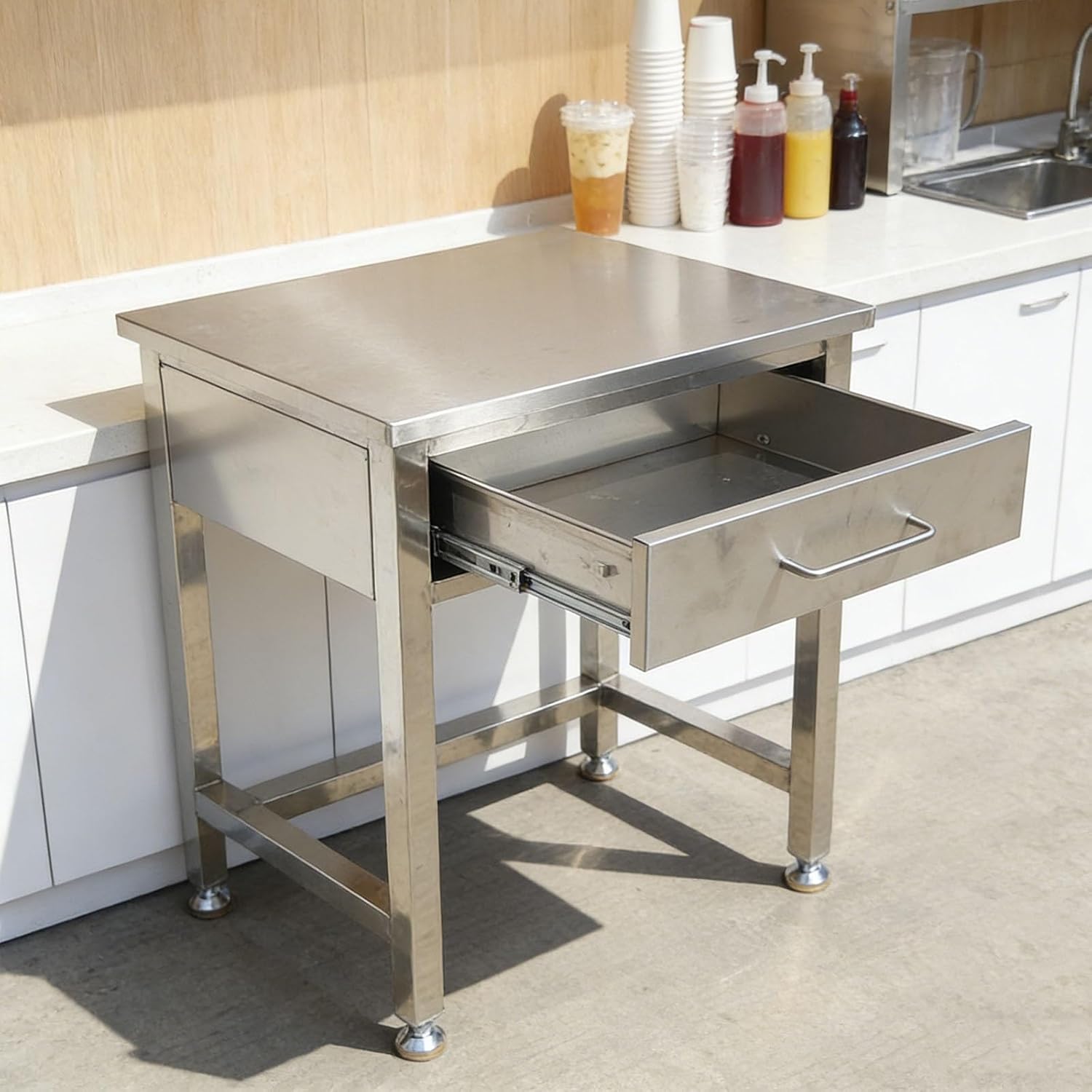 Product Name: Metal WorkbenchMaterial: Stainless SteelDimensions: 60x50x80cmConstruction: Fully welded, structurally soundPurpose: Storage/OrganizationDrawer design facilitates small item organization and enhances storage efficiencyProduct ListWorkbench x1Important Notes:Minor weld marks may appear on stainless steel surfaces due to manufacturing processesSlight scratches may be present on stainless steel componentsAll dimensions are manually measured and may have slight variationsMinor color differences may occur in images due to shooting angles and lighting conditions