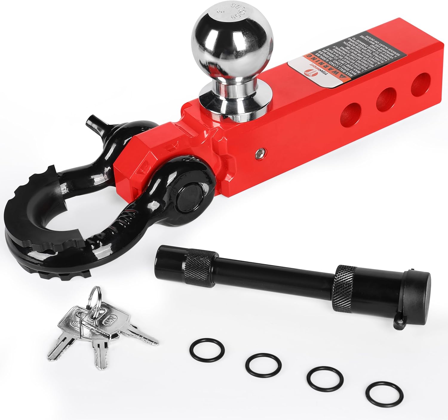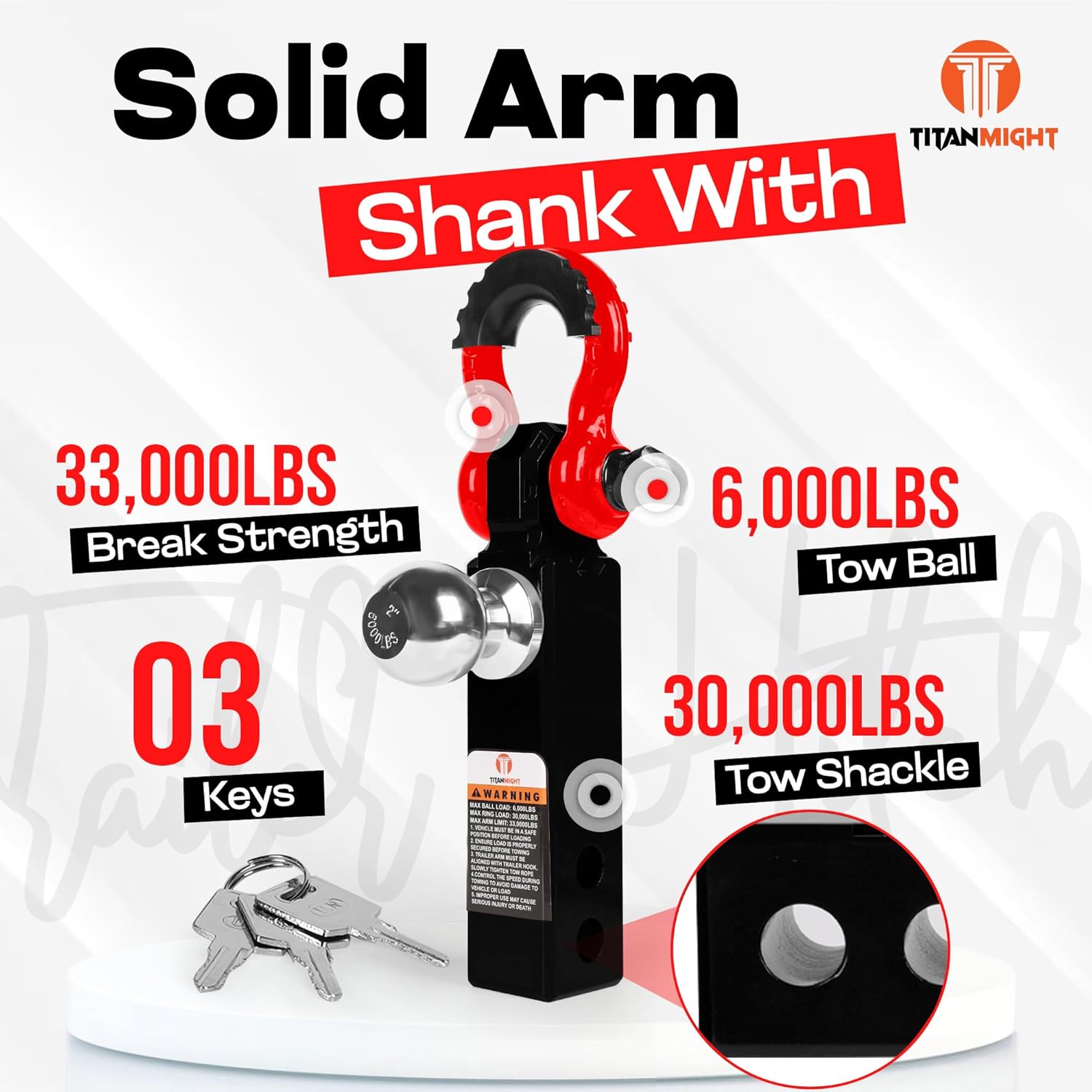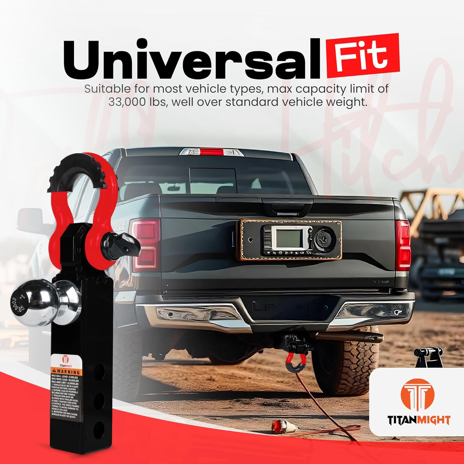 Upgrade your vehicle's towing capabilities with our TITANMIGHT heavy-duty trailer hitch. Designed as an all-in-one solution for secure and reliable hauling, it features a sturdy ball mount and a robust tow shackle. The ball mount allows for easy attachment of trailers, campers, or cargo carriers, while the tow shackle provides an additional connection point for extra stability and towing needs. Constructed from high-quality aluminium alloy steel, this trailer hitch offers superior strength and durability to handle even the toughest towing jobs. The arm shank is crafted with solid steel throughout unlike most other hollow hitches. Whether you're transporting equipment for work or embarking on an adventurous road trip, this trailer hitch ensures a safe and secure journey. With its universal fit, it's compatible with most vehicles, making it a versatile and practical addition to your towing setup. Maximize your vehicle's potential and hit the road with confidence. Benefits of Choosing Us: Waterproof, Rust-Proof & Weatherproof High Strength Aluminum Alloy Solid Arm Shank Structure (Non-hollow) Lightweight & Durable Anti-Theft Key Lock Pin (updated longer pin) Powder-Coated 30,000lbs towing capacity Satisfaction Guaranteed! Note: Please measure the hitch receiver size of your vehicle before purchasing the product. Dimensions are available on the product images. BUY TITANMIGHTs unique and durable designed heavy-duty hitch TODAY and take your towing experience to the next level. A great gift choice for your friends and family members for unforgettable memories of their adventures for a lifetime. If you have any issues with the product, feel free to contact us. We take pride in ensuring your satisfaction!