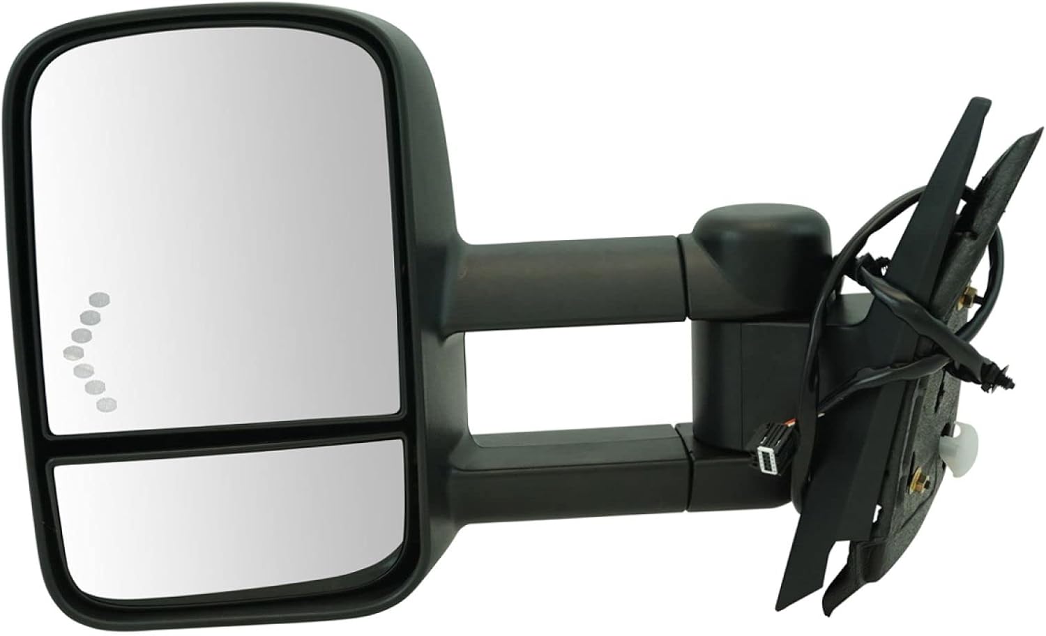 180 Degree Swing Towing MirrorFitment2007-14 Cadillac Escalade Driver Side2007-14 Cadillac Escalade ESV Driver Side2007-13 Chevrolet Silverado 1500 Driver Side Power, without Housing Turn Signal, with Mirror Turn Signal2007-14 Chevrolet Silverado 2500 HD Driver Side Power, without Housing Turn Signal, with Mirror Turn Signal2007-14 Chevrolet Silverado 3500 HD Driver Side Power, with Mirror Turn Signal2007-14 Chevrolet Suburban 1500 Driver Side2007-13 Chevrolet Suburban 2500 Driver Side2007-14 Chevrolet Tahoe Driver Side2007-14 GMC Sierra 1500 Driver Side Power, without Housing Turn Signal, with Mirror Turn Signal2007-14 GMC Sierra 2500 HD Driver Side Power, without Housing Turn Signal, with Mirror Turn Signal2007-14 GMC Sierra 3500 HD Driver Side Power, without Housing Turn Signal, with Mirror Turn Signal2007-14 GMC Yukon XL 1500 Driver SideProduct AttributesMounting Hole Quantity: 3Wiring Harness Length: 66.14 inConnector Terminal Quantity: 7Housing Color: BlackCover Color: BlackGlass Color: ClearAdjustment Type: ElectricGlass Surface: FlatExtendable Mechanism: ManualFold Away Mechanism: ManualAutomatic Dimming Included: NoAspherical Glass: NoReverse Gear Tilt-Down: NoBlind Spot Indicator: NoTemperature Sensor Included: NoConvex Shaped Glass: NoUtility Spotlight: NoIntegrated Puddle Light: NoSide View Camera Included: NoLane Departure Warning System: NoManual Remote Control: NoHousing Turn Signal Indicator: NoMemory Setting: NoMounting Hardware Included: NoMaterial: PlasticHousing Finish: TexturedCover Finish: TexturedHeated: YesBlind Spot Mirror Included: YesMirror Turn Signal Indicator: YesMirror Folding Type: 180 Degree SwingTowing Mirrors Features & Benefits: Features and BenefitsMirror Type: TowingReference Numbers1594016020862098258159782587908325879085GM1320354GM1322108